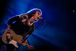 Some women in punk rock have used their music and lyrics as platforms for feminist ideologies, and to oppose the sexualization of female musicians and societal policing of women's bodies and sexual agency.[36] As early as the 1960s, women in rock were often considered as sex objects and their capabilities and talent were often undermined while male producers were credited for their music.[36] Some female punk and riot grrrl lyrics called for women to challenge the patriarchy and rape culture, such as 7 Year Bitch's song "Dead Men Don't Rape". Bikini Kill expressed the need for a revolution in pursuit of disrupting the patriarchy, for example their song "Rebel Girl".[37] Some musicians lyrics expressed themes of queer liberation, as in Gossip's "Where the Girls Are".[37] Conventional expectations of women's roles were challenged, for example, in the Slits' "Typical Girls", that sarcastically addressed stereotypes of women as being "too emotional".[38] Riot grrrl artists and their punk predecessors not only fought for women, but for the LGBTQIA+ community, animal rights, and human rights in general.[37] Punk, as non-normative as it has traditionally been, has (in some cases) become a safe haven for many unaccepted individuals, including queer people. Punks and the punk lifestyle are often outside of the realm of normative culture, and the same can be said for queer individuals.[39] The discomfort in this outcast identity may bring feelings of solidarity for people in punk scenes, queer and otherwise.[39]