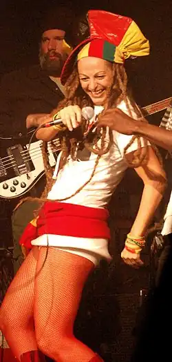 Ari Up (1962–2010) was born Ariane Daniela Forster in Munich, West Germany, and was a vocalist and member of the Slits, a British punk rock band. She was only 14 years old when she became the Slits' frontwoman in 1976, and was known as the most flamboyant and eccentric member of the group. She took guitar lessons from Joe Strummer of the Clash.[59][60] Up's mother was the music promoter Nora Forster,[61] a publishing heiress of the German newspaper Der Tagesspiegel whose home became a crash pad and meeting place for many rock musicians, and who financially helped support the Slits, the Sex Pistols and the Clash. Ari Up grew up within this creative milieu where she was raised by Forster and John Lydon.[62][63][64]