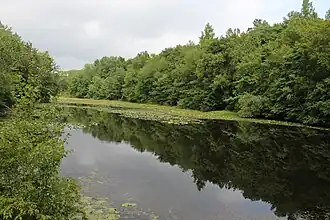 After a 1955 flood devastated the Norwalk River Valley, the state of Connecticut bought up and safety-dammed several feeder streams in order to control floods. About 1969, Ridgefield First Selectman J. Mortimer Woodcock arranged to lease 140 acres (0.57 km2) of the property along Spectacle Creek in Wilton and Ridgefield (130 acres in Wilton) for a nature center, and in 1972 the Woodcock Nature Center was opened.[2]