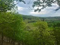 The Senedo people lived in the Shenandoah Valley around Woodstock, but they disappeared as a tribe prior to European settlement, possibly from attack by the Catawba people to the south.[11] By the time the German settlers arrived, few Native Americans lived in the Shenandoah Valley.[12][13] Several later tribes hunted in the valley, among them the Shawnee, Occoneechee, Monocans and Piscataways and the powerful Iroquois Confederation, so while not inhabiting the area Indians were likely not an uncommon sight.[10] The seven bends have locations associated with Indian mounds dating back to the Late Woodland Period (AD 900–1650) in the area of the river between Woodstock and Strasburg, Virginia. After 250 years of plowing by settlers, the mounds have largely disappeared from sight, though traces of them have been detected with aerial photography