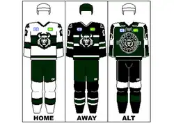 In the 2011–12 season the Slammers joined numerous sports teams across the world in unveiling their own vintage-style third jersey. It is a green jersey with white stripes running down the arms. Outside these stripes are a series of stripes coloured black, green, white, black, green, white, black and green starting at the collar. The collar itself has laces (in keeping with the vintage design) and the bottom of the jersey has a white then black stripe (in descending order) to the bottom of the jersey. The logo is a circle containing the team name around the Slammer's Head logo, with extending tabs that proclaim the teams establishing year as 2003.