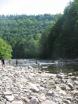 Edward Gertler, author of Keystone Canoeing, writes that Loyalsock Creek's "exciting whitewater, above Forksville, has long been a favorite of paddlers who are quick and tolerant enough to endure its fickle water levels and weather".[74] This is the stretch of the creek in and near the park, whose "long, steepening, and complex boulder patch and ledgy rapids demand your attention ... A boater's chute through the middle of the swimming area dam at Worlds End State Park climaxes this run".[74]