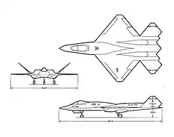 - ^ The DP527 drawings show the same F119 engines as the Air Force version, but the final powerplant may have been a modified variant with greater bypass ratio for improved fuel efficiency at the expense of supercruise performance.[39]
