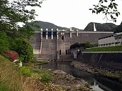 The Yabakei Dam is a 62.0 meter high gravity-type concrete dam under the direct control of the Ministry of Land, Infrastructure, Transport and Tourism managed by the Kyushu Regional Development Bureau of the Ministry of Land, Infrastructure, Transport and Tourism.[1] It is the main dam in the Yamakuni River system, and is a specific multipurpose dam for the purpose of hydraulic control, water utilization and hydroelectric power generation from the Yamakuni River's tributary the Yamautsuri River. Together with the Heisei Ozeki Barrage, which is located downstream, it occupies an important position not only in Nakatsu City but also in Kitakyushu City, Fukuoka Prefecture and the Kyogetsu area.