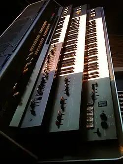 The Yamaha GX-1, first released as Electone GX-707,[a][3] is an analog polyphonic synthesizer developed by Yamaha as a test bed for later consumer synths and Electone series organs for stage and home use. The GX-1 has four synthesizer "ranks" or three manuals, called Solo, Upper, and Lower, plus Pedal, and an analog rhythm machine.[2] The GX-707 first appeared in 1973 as a "theatre model" for use on concert stages, before the GX-1 was publicly released in 1975.[1]