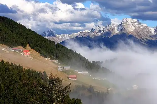 Yayla is a Turkic name given to settlements or areas which are suitable for summer mountain resorts and summer highland transhumance. The term is also cognate with the related Turkic term yaylak. Since in Oghuz languages the last -k or -ı(g) sounds generally drop as in examples such as yazı(g), dizi(g), dolu(g), ölü(g), with the last letter dropped as yayla (opposing to yaylak or yaylag), it is only in use in Turkish and other closely related languages such as Crimean Tatar, Gagauz, Balkan Turkish and Azerbaijani.[1][2]