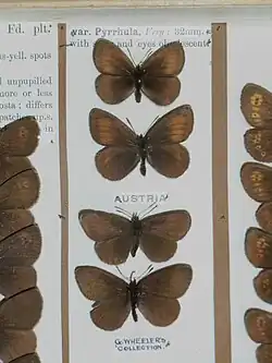 E. manto Esp. (= erina F., pyrrha F., oeme var. Esp.) (36 g). The russet band of the forewing consists mostly only of oval spots, in which there are 2 — 3 black dots. The hindwing has often, but not always, some russet-red small obsolescent spots. The underside is brown in the male, the band of the forewing being more prominent and better defined than above, and is often continuous. The band of the hindwing consists of some russet-red spots, which bear occasionally some black dots. The female is visibly lighter beneath, the central area of the forewing being brownish, the fore and distal margins as well as the hindwing densely dusted with yellowish grey. At the base of the hindwing there are a number of ochreous spots, moreover some yellow spots extend from the costal margin to below the apex of the cell, sometimes merged to a broader abbreviated band, there being often some smaller additional spots near them forming a row which is parallel with the distal margin. Fringes in the male somewhat lighter than the ground colour, in the female grey. The species distributed over the whole chain of the Alps, being plentiful in many places; it occurs on grassy slopes of the alpine and subalpine districts; also on the mountains of the Auvergne and in the Pyrenees, as well as on the mountains of Hungary. In ab. bubastis Meissn. (= pyrrha maccabaeus Frr.) from the northern Central Alps the hindwing beneath bears a white band: the fringes are dark chequered. — ab. caecilia Hbn. (36 g), which is above uniformly black-brown without spots, occurs in Switzerland and the Tyrol among the name-typical form, but is rare. — A similar form with the ground colour more greyish brown but also without markings, flies in the Pyrenees; this is constans Elwes (= caecilia Dup.) (36 g). — In the Swiss and Tyrolese Alps, high above the tree-line, there flies a very small form, pyrrhula Frey (36 h), which is scarcely as large as pharte The forewing has some small streak-like russet- brown spots, in which there are lint rarely- small black dots. The hindwing is without markings as a rule, only occasionally showing small brown wedge-shaped spots. The underside as in manto, just the markings reduced. — trajanus Hormuz. differs from the first described form chiefly on the underside. The forewing of this form is light reddish brown, being dusted with yellowish grey towards the apex and costa; the light reddish yellow band is dentate between the veins both distally and proximally or there are feeble teeth only on the proximal side, the band bearing always two distinct ocelli in cellules 4 and 5. The hindwing greenish grey beneath, the spots of the distal band of different sizes, not being reddish yellow as in the normotypical form, but whitish yellow, the basal spots are completely absent. Distribution-area: Bukowina. — The form from the Vosges has been described as vogesiaca Christ., the females being without light basal spots on the hindwing beneath. — Larva greenish yellow, with the head and legs honey-colour; on the back 2 rows of black comma-spots. Pupa yellow, with lilac markings. The butterfly emerges in 3 weeks from the pupa, which lies free on the ground. The species is plentiful and is on the wing from June to August.[1]