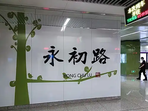 Yongchulu station (Chinese: 永初路站; lit. 'Yongchu road station'), is a station of Line S3 of the Nanjing Metro. It started operations on 6 December 2017.[1] On 28 December 2023, with the opening of the southern part of Line 7, it became an interchange station between Line 7 and Line 10.[2] The station name is derived from the era name "Yongchu" of Emperor Wu of the Song Dynasty.[3]