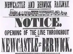 Passengers were carried over the railway for the first time in March 1840 as one of the series of connecting services between Newcastle and Darlington.[20] On 14 September 1843 the company was bought by N&DJR, as its planned route between Newcastle and Darlington involved running over the railway and the DJR was operating at a loss and unable to upgrade the track.[21][22]