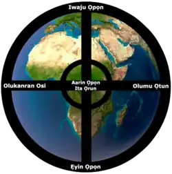 According to Kola Abimbola, the Yorubas have evolved a robust cosmology.[2] Nigerian Professor for Traditional African religions, Jacob K. Olupona, summarizes that central for the Yorùbá religion, and which all beings possess, is known as "Àṣẹ", which is "the empowered word that must come to pass," the "life force" and "energy" that "regulates all movement and activity in the universe".[5][6][7] Every thought and action of each person or being in Ayé (the physical realm) interact with the Supreme force, all other living things, including the Earth itself, as well as with Ọ̀run (the otherworld), in which gods, spirits and ancestors exist.[3][6][7] The Yorùbá religion can be described as a form of diffused monotheism, with a Supreme but distant creator force, encompassing the whole universe.[7]