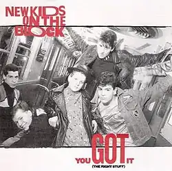 "You Got It (The Right Stuff)" is a 1988 single from New Kids on the Block. The lead vocals were sung by Jordan Knight and Donnie Wahlberg. The second single from the group's second album Hangin' Tough, "You Got It (The Right Stuff)" peaked at number three on the Billboard Hot 100. Outside of the United States, "You Got It (The Right Stuff)" topped the charts in Australia and the United Kingdom.[2] On the album, it was simply listed as "The Right Stuff"; the change to the single was probably to avoid confusion with Vanessa Williams' debut hit "The Right Stuff", which charted earlier that year. A Spanish version of the song was made ("Autentica") and peaked at number 11 in Spain.[3]