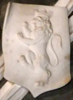 Surviving sources[14] do not enable Zachary Hamlyn's origins to be connected to the ancient Devonshire gentry family of Hamlyn of Widecombe and Buckfastleigh, resident at Widecombe in 1522 and still at Buckfastleigh in the late 19th century.[15] However, the arms of the Hamlyn family of Widecombe and Buckfastleigh (Gules, a lion rampant ermine crowned or),[16] appear on the monument to Zachary Hamlyn in Clovelly Church. The Hamlyn family is believed to have descended from Hamelin,[17] the Domesday Book tenant in 1086 of two manors (Alwington and Broad Hempston) under the Norman magnate Robert, Count of Mortain (d.1090),[18] half-brother of King William the Conqueror. He may have been the same Hamelin who also held two manors in Cornwall from the same overlord.[19] Sir John Hamlyn, of Larkbeare, in the parish of St Leonard, Exeter, father of Sir Osbert, was at the Battle of Bouroughbridge in 1322, and his arms are recorded on the roll of arms of the Knights present: Gules, a lion rampant ermine, crowned or.[20][21]