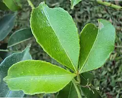 This is a liana with woody, corky, thorny stems that climb on trees, reaching up to 10 m in length. It has shiny green citrus-scented leaves, yellow-green flowers, and orange fruits about half a cm wide that taste like orange peel.[3] The seeds are dispersed by birds and monkeys that eat the fruits.[3] In particular, the scaly-breasted munia prefers to nest in these trees.