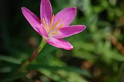 Zephyranthes minuta is a bulb-forming perennial with shiny green leaves up to 7 mm wide. Flowers in wild specimens are usually pink, funnel-shaped, up to 9 cm long. Cultivated specimens are frequently larger, often with extra tepals.[2][6]