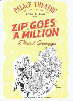 Zip Goes a Million began its pre-London tryout at the Hippodrome, Coventry, on 4 September 1951. The production was directed by Charles Hickman, with choreography by Pauline Grant.[1] The production nearly did not open, as Perry had not "paid her 'Equity premium for foreign performers' (she belonged to the Variety Artistes' Federation, which she felt was sufficient) and all the actors were called out on strike by Equity." Maschwitz paid the fee himself after a court hearing, and the musical began its run.[1] Another tryout took place from 17 September to 16 October 1951 at the Palace Theatre in Manchester, where the musical was trimmed and several musical numbers were cut.[3]