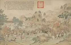 The Qing army met almost no resistance and destroyed the Dzungar Khanate within the span of 100 days.[41] The Chinese army, supplemented on the way by Muslim and renegade Dzungar troops, surprised Dawachi at the site of Borotola in June 1755, about 300 li from Ili.[42] Dawachi had about 10,000 troops, and retreated to Mount Keteng, about 80 li from Ili, while sending messengers for reinforcements, but the messengers were intercepted by the Chinese. The Qing army was able to surprise and capture Dawachi's army at the camp, and a charge was led by the Dzungar renegade Ayusi and 20 of his men, who stormed the camp and where able to conduct about 8,000 prisoners to the Chinese camp (an event depicted in the Qing painting "Storming of the Camp at Gädän-Ola").[42] Only 2,000 soldiers escaped with Dawachi at their head.[42] Dawachi fled into the mountains north of Aksu but was captured by the Uyghur leader Khojis, beg of Uchturpan, at the request of the Chinese, and delivered to the Qing.[43]